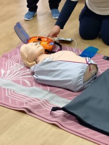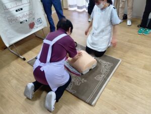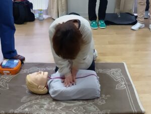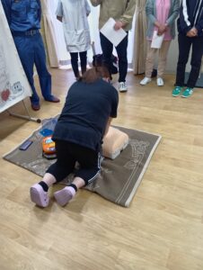 そして、AEDと心臓マッサージの体験。心臓マッサージは、力と体力が必要です。