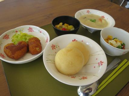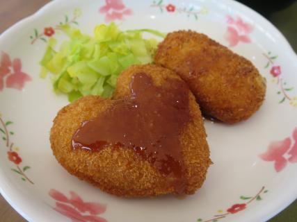 「愛」にちなんで、今日のコロッケはハート形でした♡ おやつは、チョコババロア