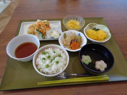 本日のお昼は”春御膳”でした。豆ご飯・えびかき揚げ・