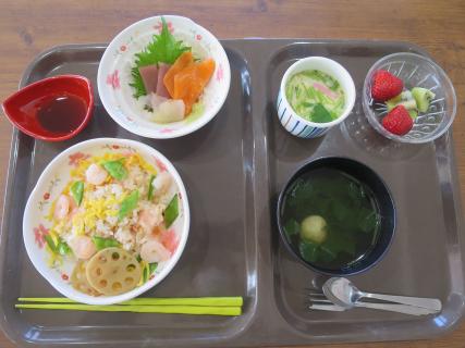 本日の昼食は特別メニューです。チラシ寿司、お刺身、茶わん蒸し、彩りが鮮やかでおいしくいただきました!(^^)!