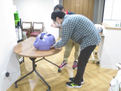研修前に特殊な液体を手指に塗り込んだ後、普段行っている手洗いをして、特殊な機械の中に手を入れて確認をしてもらい