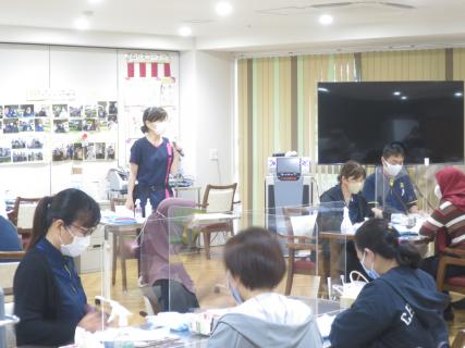 研修会の前半は、施設看護師により「感染症対策の原則」や予防策などについて講義が実施されました。(^^♪