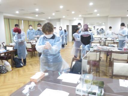 後半は、看護師の指導により実際に防護服を着て、正しい着脱方法について学びました(^^♪