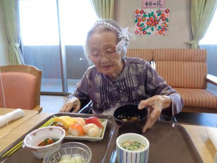 「ここでお寿司が食べられるなんて!!」「どこのお店のお寿司なの?今度行ってみたいわ。」と笑顔でお召し上がりにな