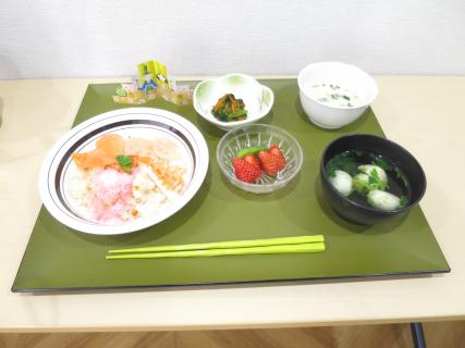 今年は、メイン料理はに彩りチラシ寿司でした。サーモンやエビをトッピングして桜デンブの鮮やかなピンクが彩りに花を