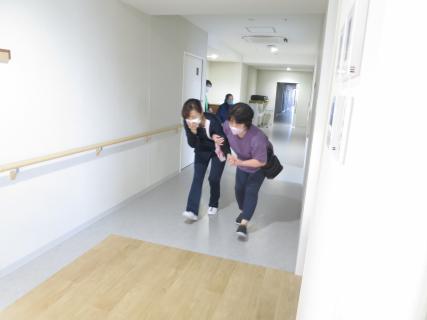 研修会の後半の部では、職員が車いす使用、歩行可能、寝たきりの利用者様役を演じ2名の当直職員でどのくらいの時間で