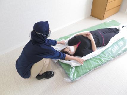 また、シーツや毛布を利用した利用者様の移動方法についても学び、実際に特養の職員さんに実践してもらいました。