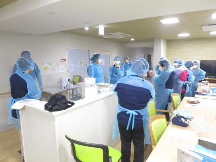 研修の後半の部では、PPE(個人用防護服)の着脱を参加者