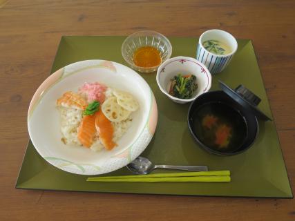 彩り散らし寿司・茶碗蒸し・舞茸と畑菜の胡麻和え・柿ゼリー・清汁(生麩、貝割)
