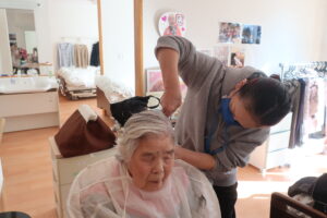 今日は入居者様に面会にいらしたご家族様が、お母様のヘアカットをするという事でその様子を見学