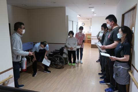 避難訓練参加職員は13名、ご入居者役と職員役と分かれ、消火器の使い方から誘導まで行いました。