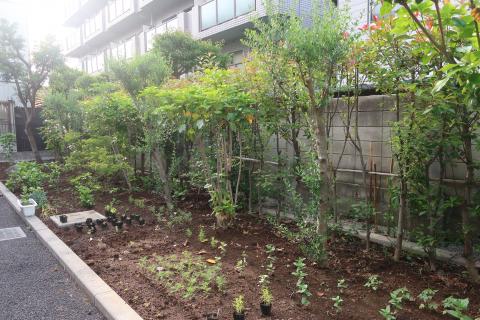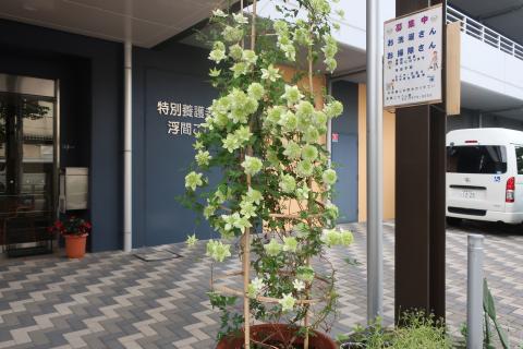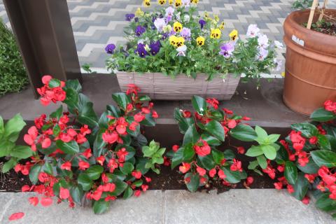 こひつじ園を通る人たちも、エントランス前のお花たちに