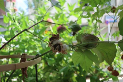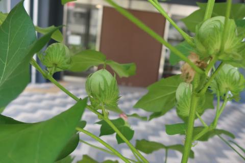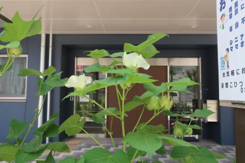こひつじ園の玄関前の花壇に植えてある植物たちの中に「綿」があります。